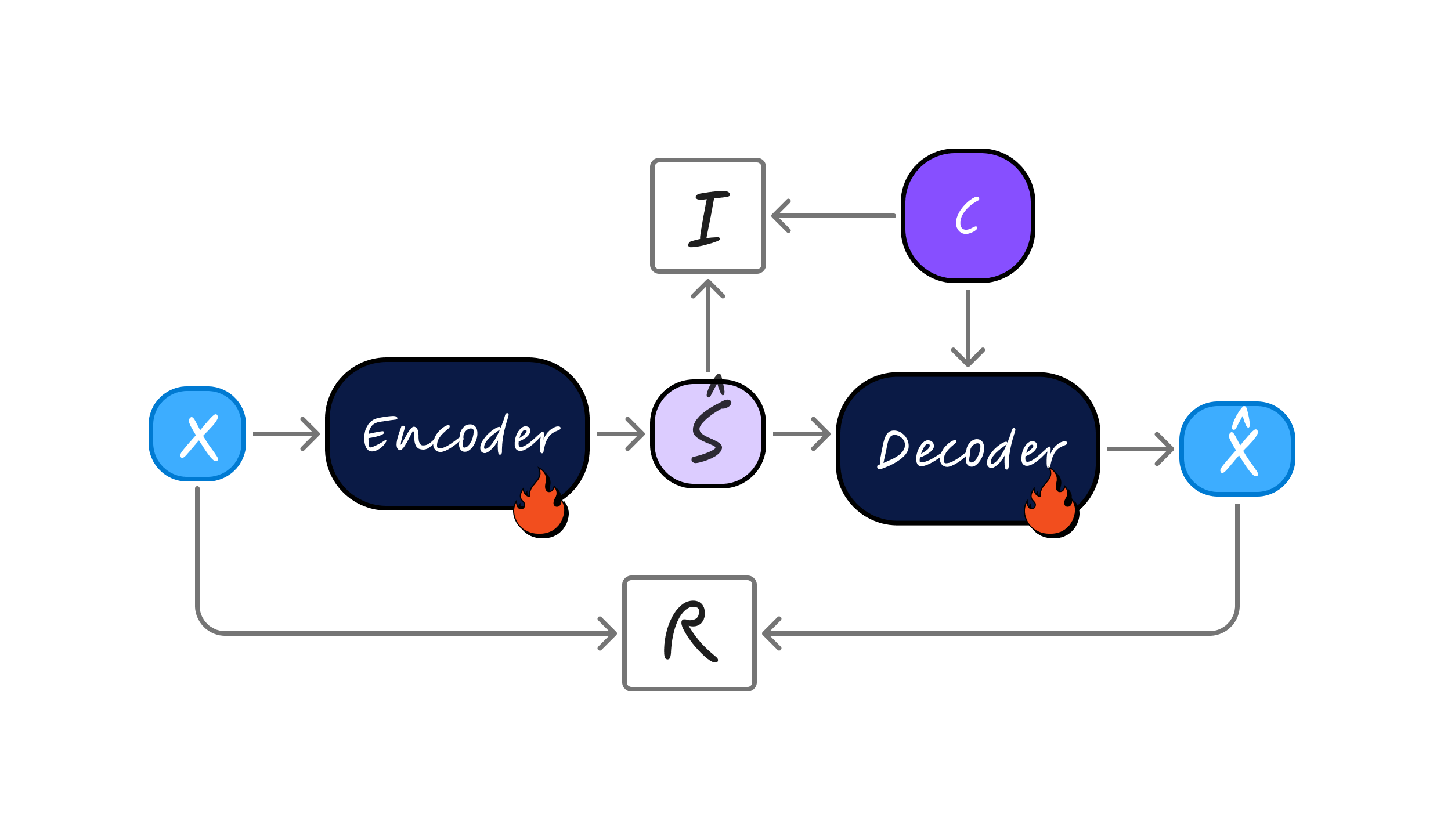 Indepedence-based Voice Conversion (IVC) consists of an encoder predicting content-like latent variable Ŝ and a decoder conditioned on speaker, emotion, or loudness embeddings C. The model is trained with discrepancy loss R and independence loss I